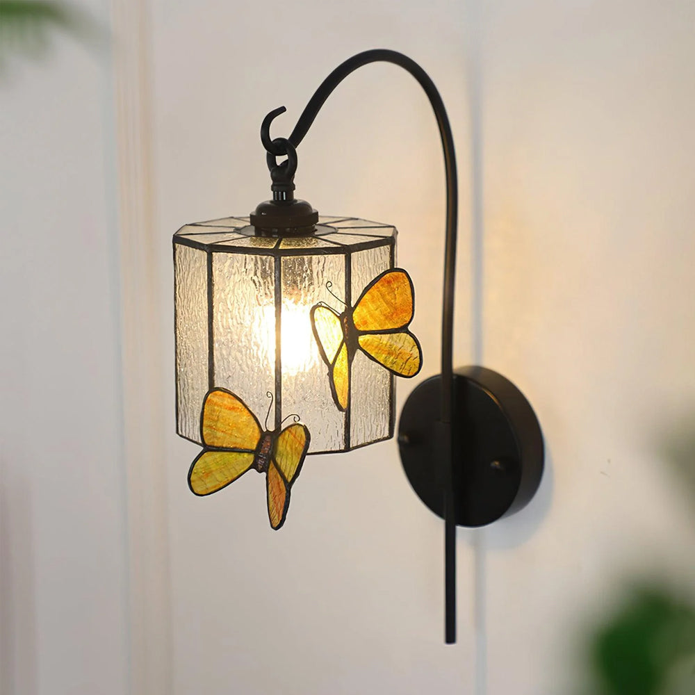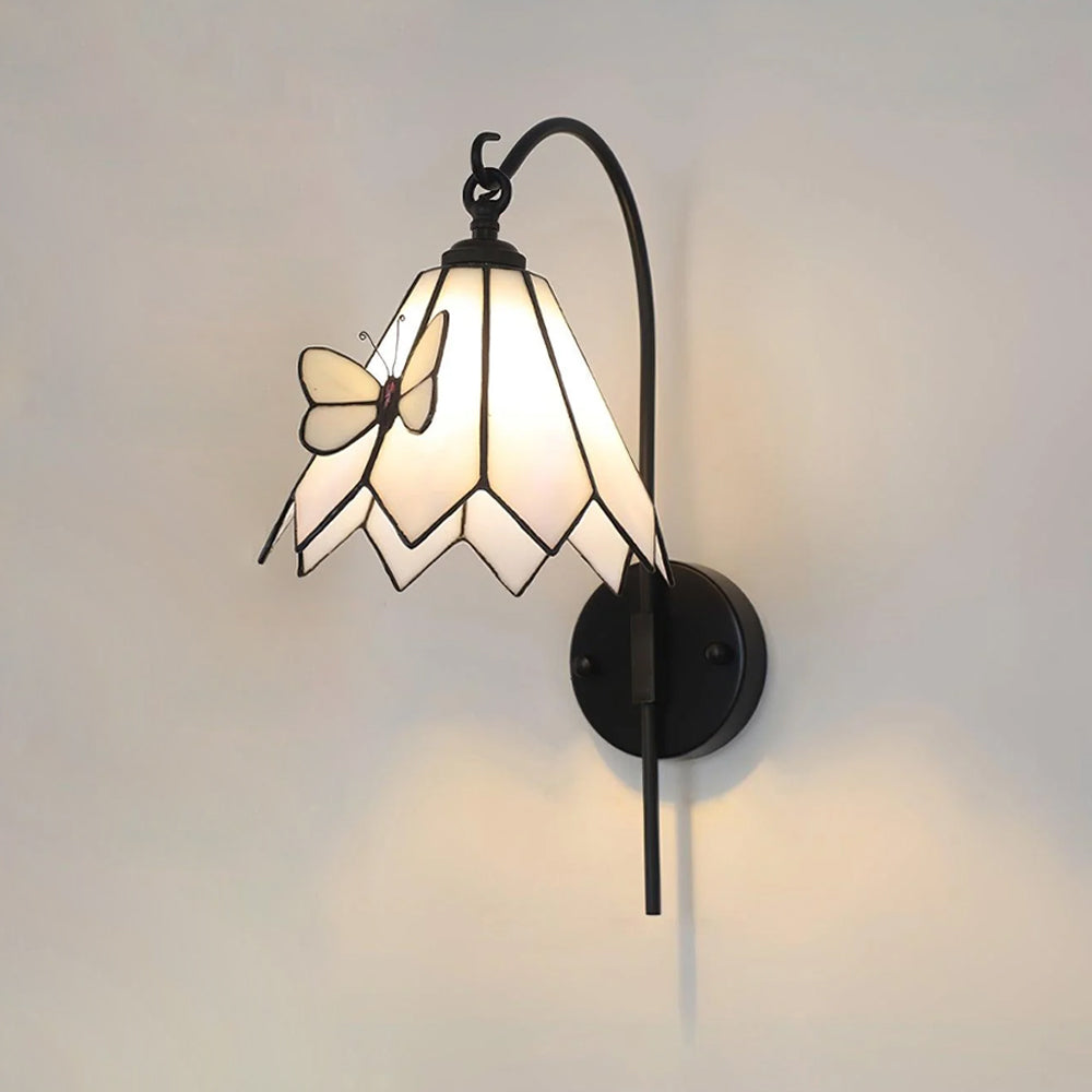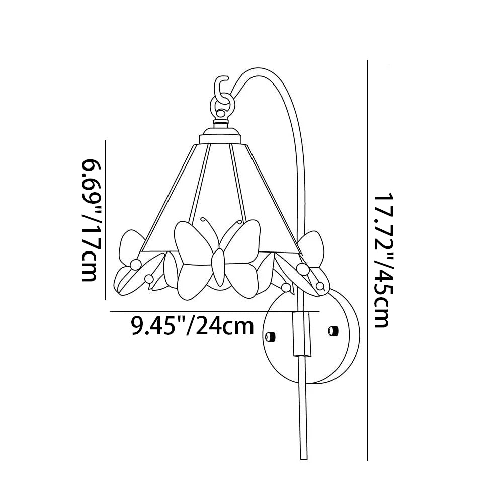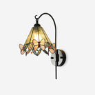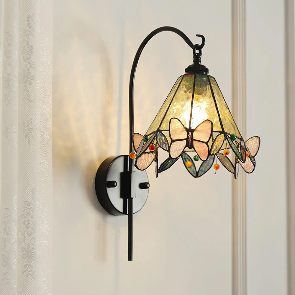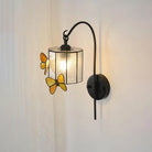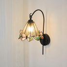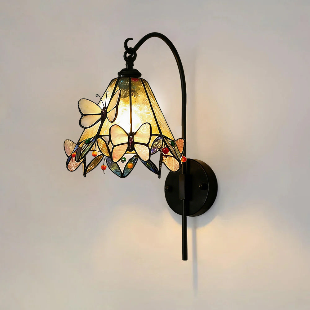 This Vintage Delicate Tiffany Butterfly Metal Wall Lamp fuses classic and modern styles. Its Tiffany glass shade with butterfly motifs contrasts sleek black metal, emitting warm, enchanting light.