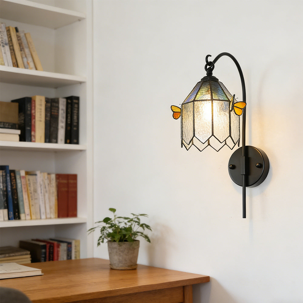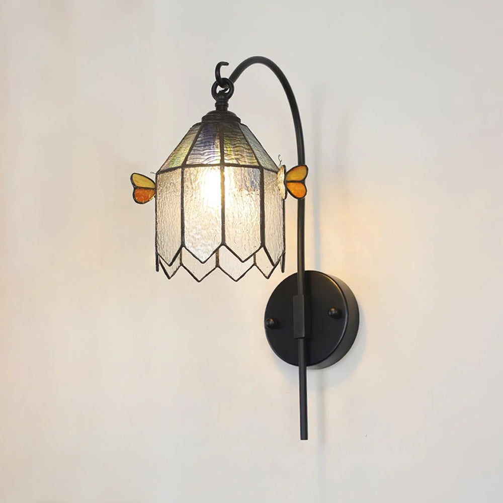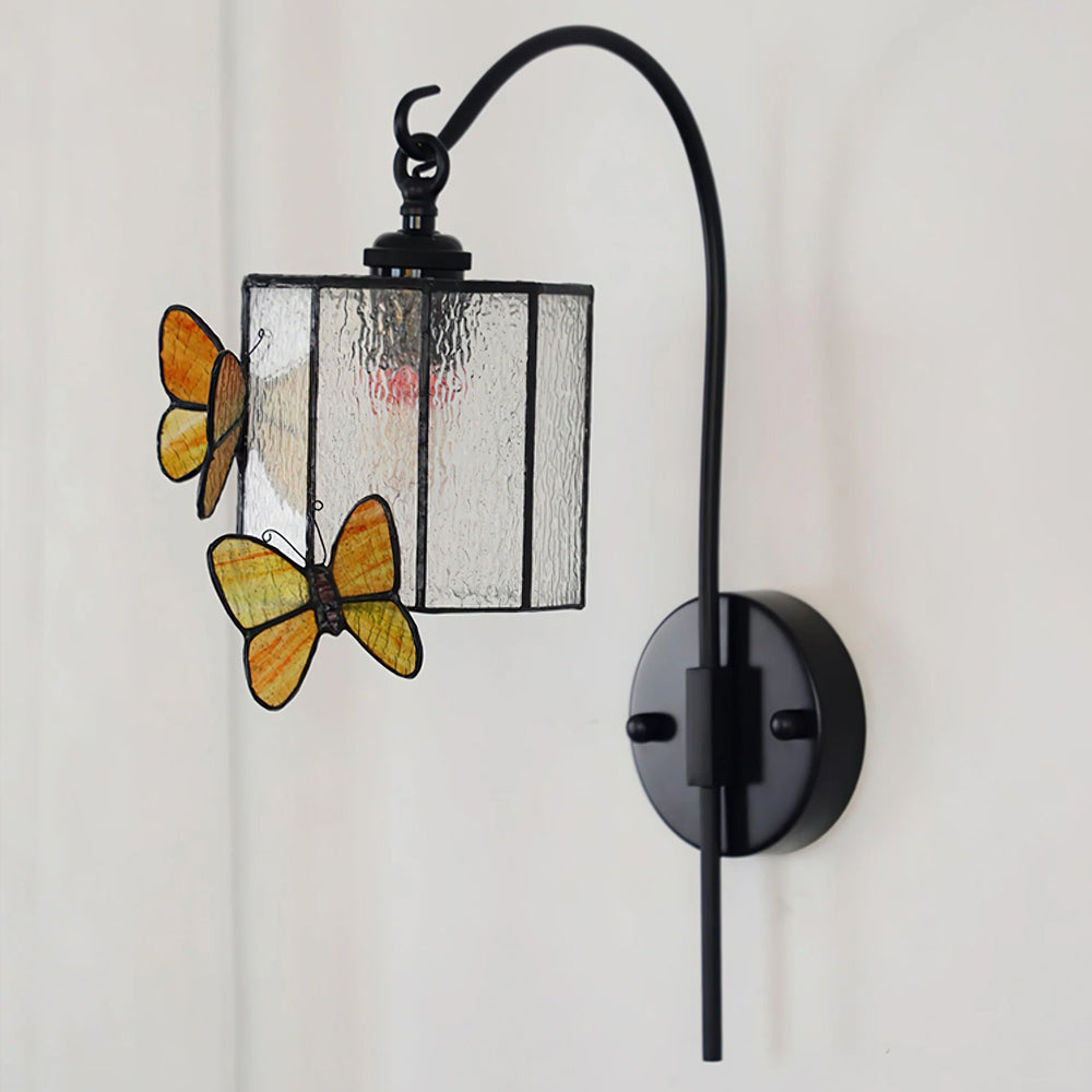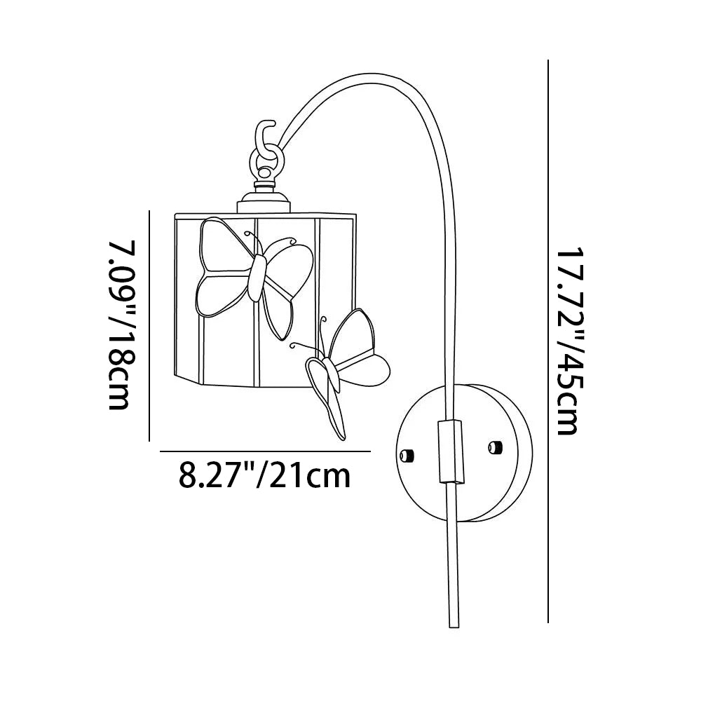 This Vintage Delicate Tiffany Butterfly Metal Wall Lamp fuses classic and modern styles. Its Tiffany glass shade with butterfly motifs contrasts sleek black metal, emitting warm, enchanting light.