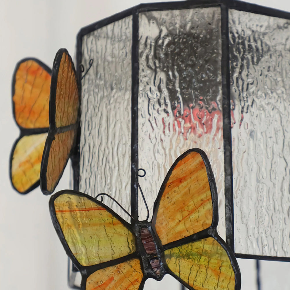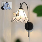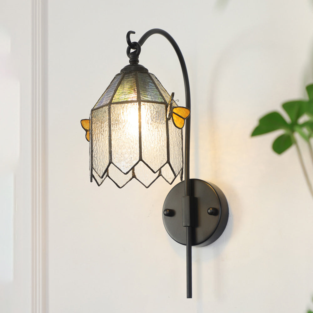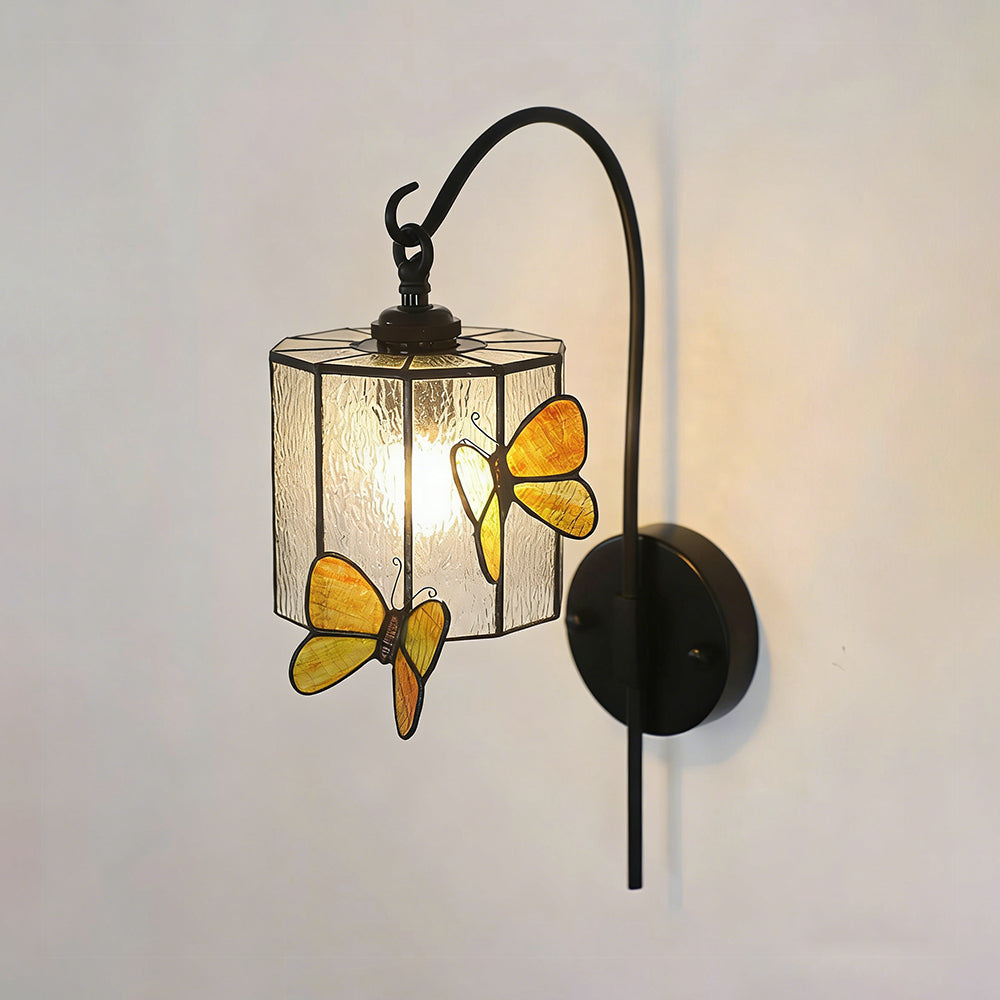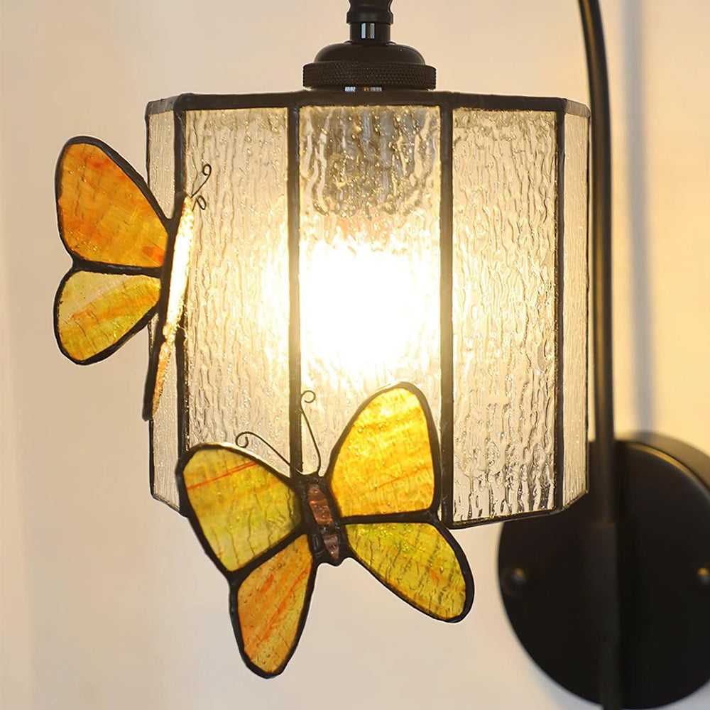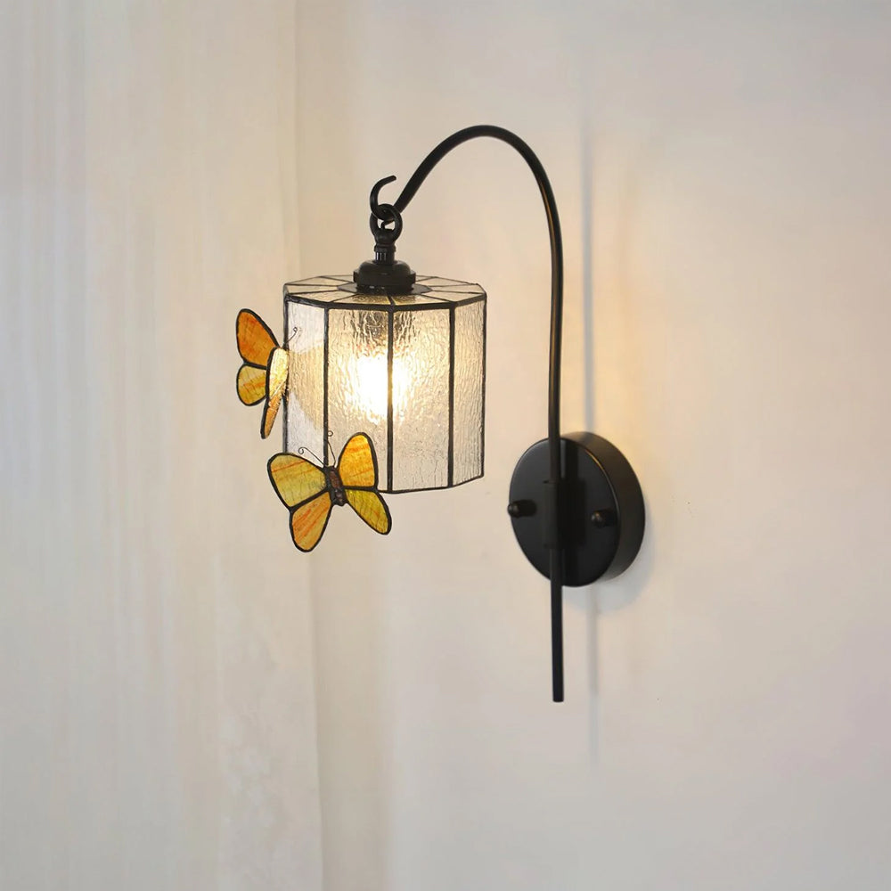 This Vintage Delicate Tiffany Butterfly Metal Wall Lamp fuses classic and modern styles. Its Tiffany glass shade with butterfly motifs contrasts sleek black metal, emitting warm, enchanting light.
