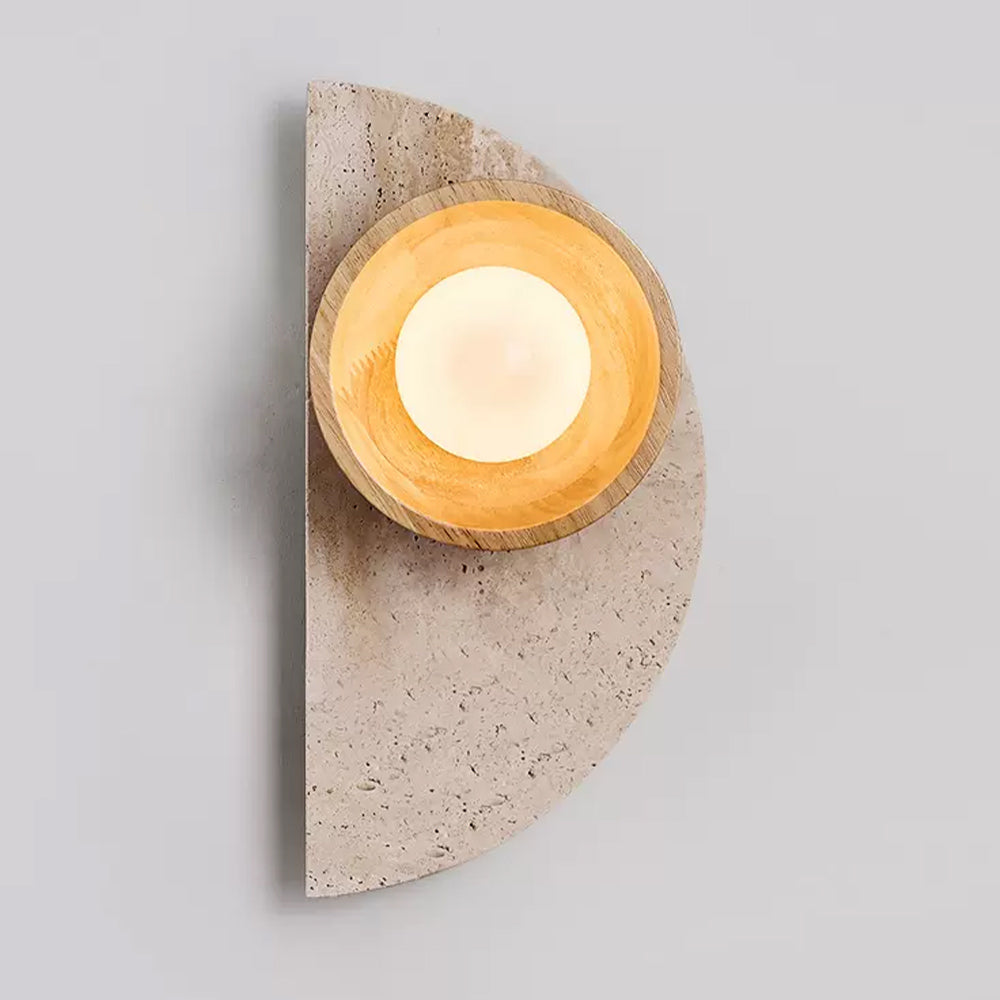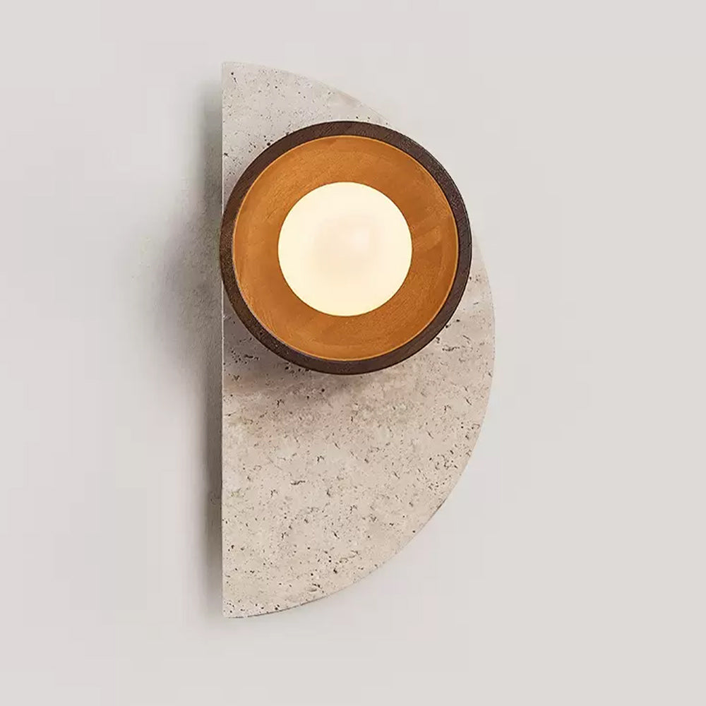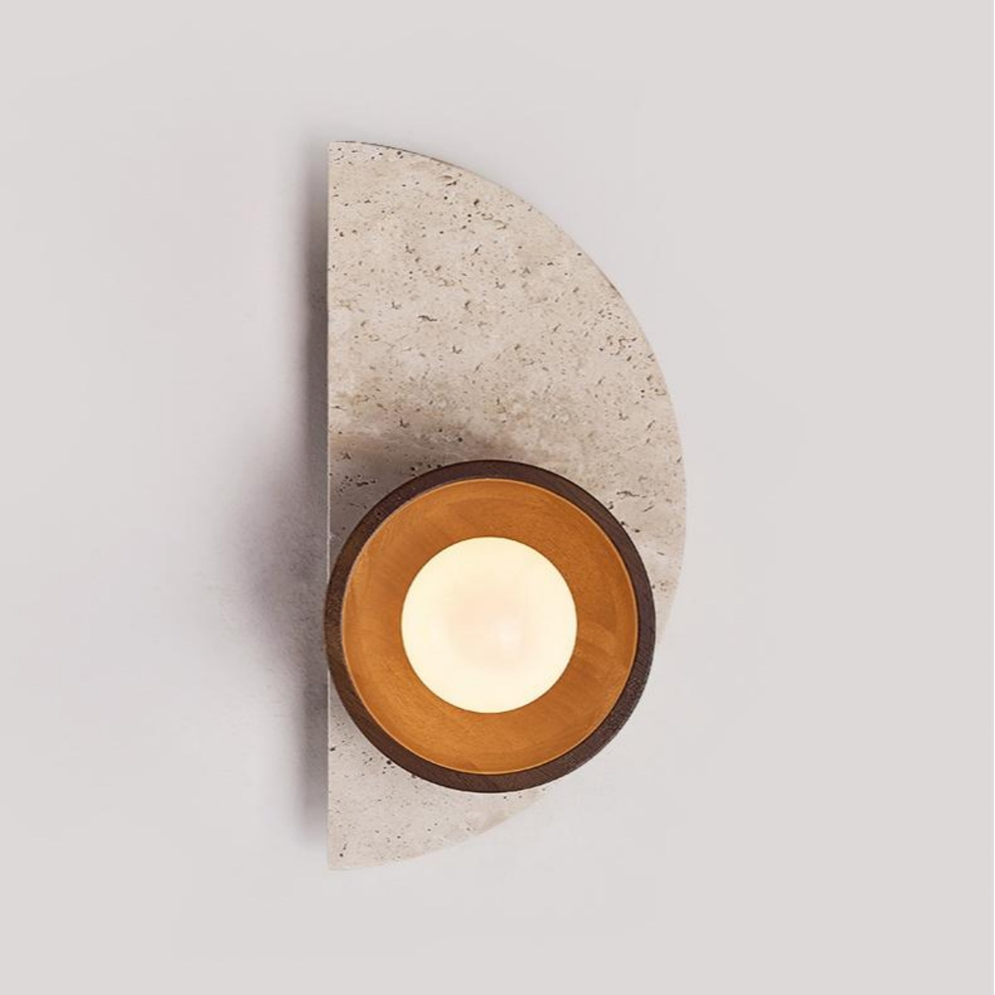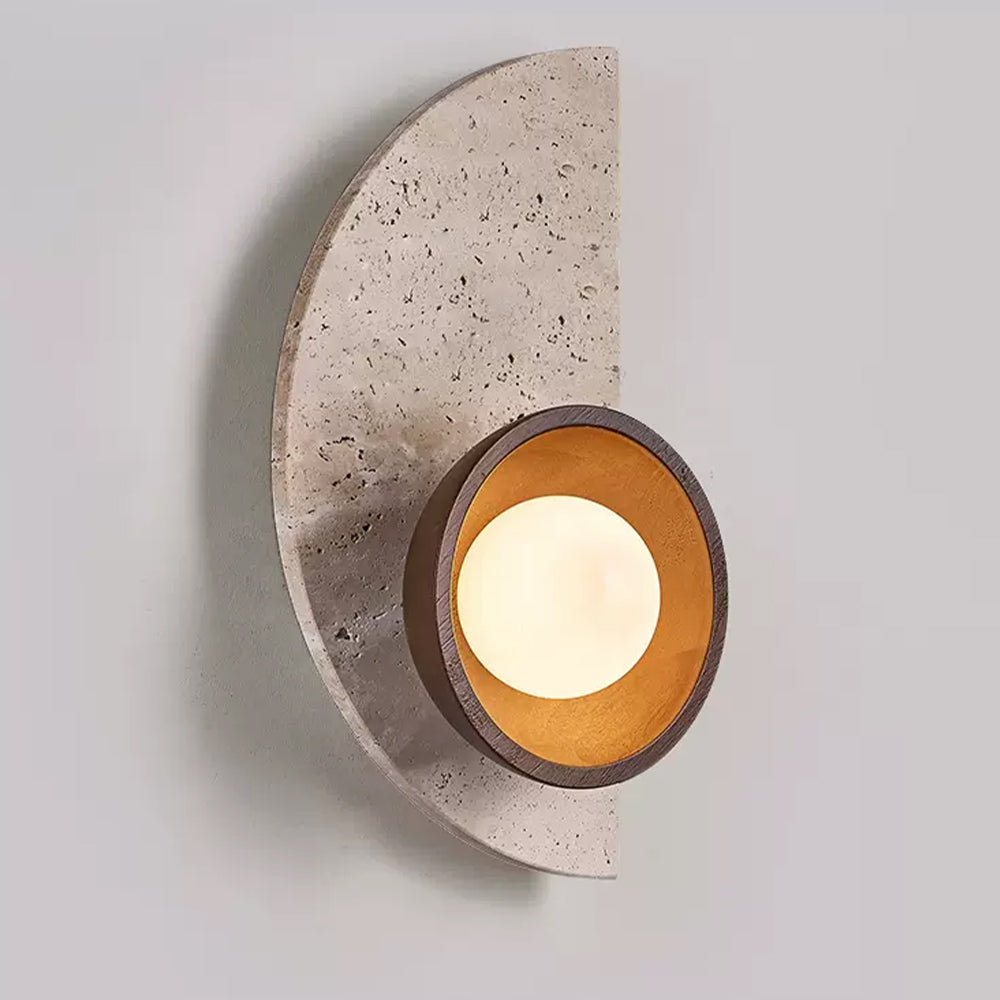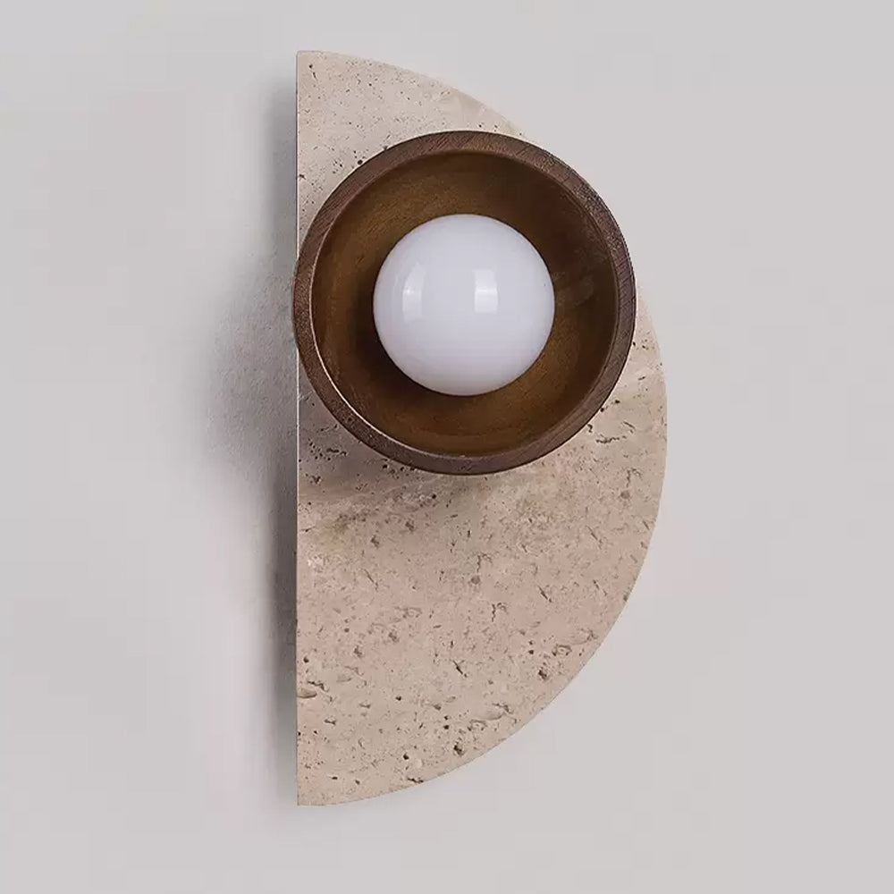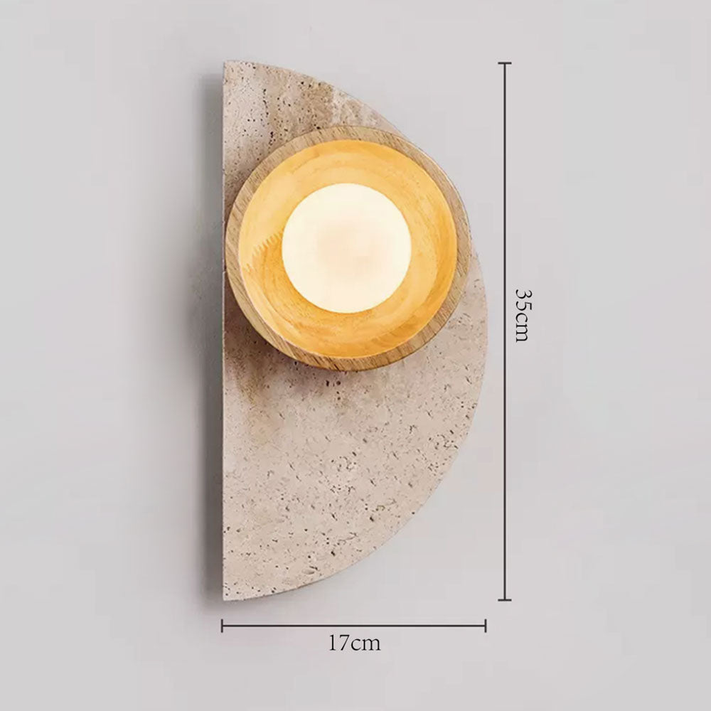 This wall lamp perfectly combines classic and modern elements, creating a feeling of time travel. The unique texture and feel of the travertine make the background wall full of natural and simple atmosphere; the warmth and texture of the solid wood add a touch of warmth and comfort to the whole space; and the addition of the glass art lamp not only brings soft light to the living room, but also makes the whole space full of artistic and romantic atmosphere under the background of the light.
