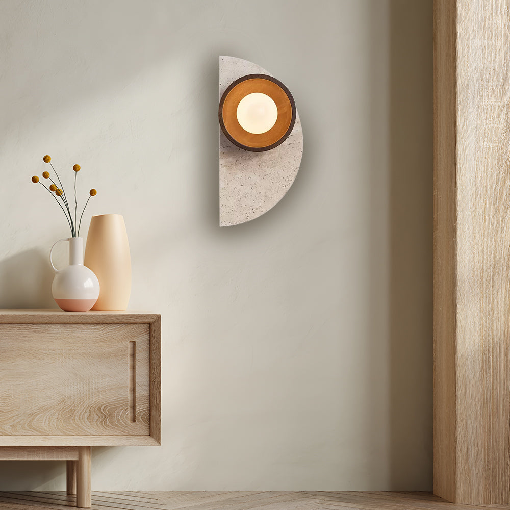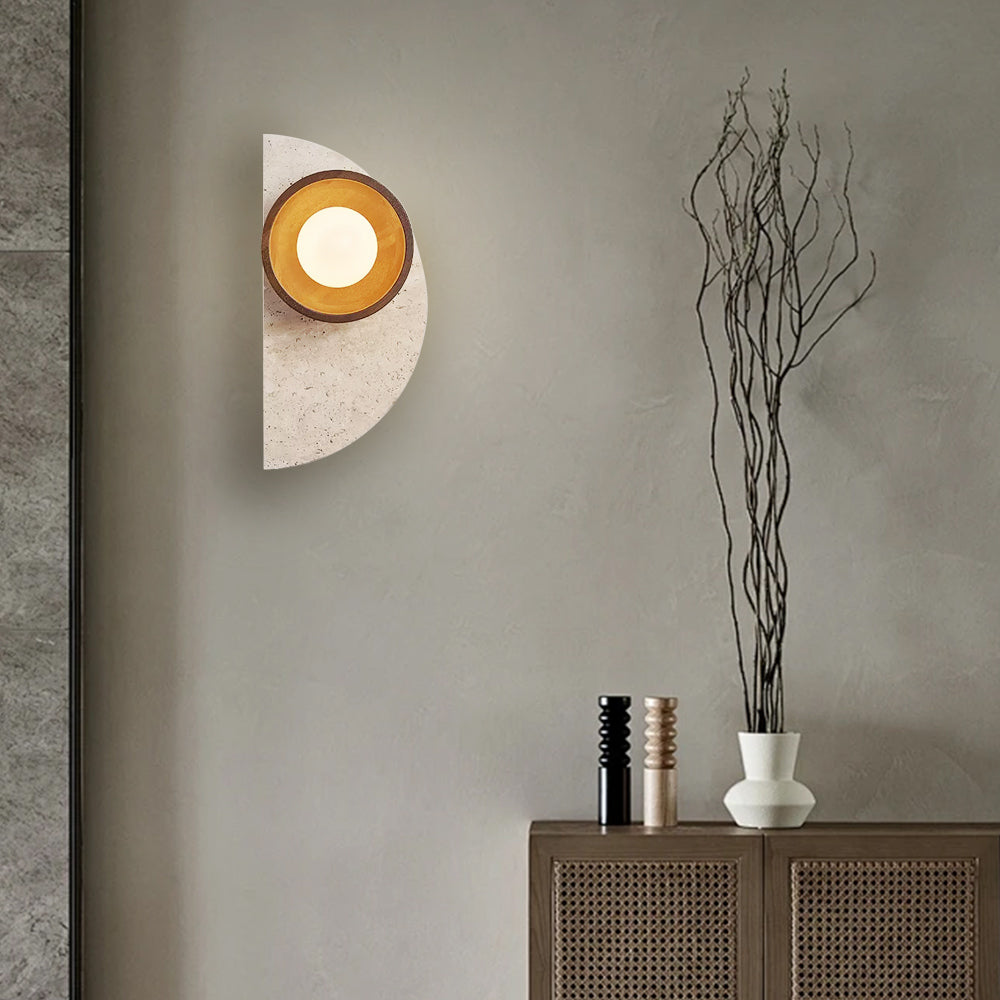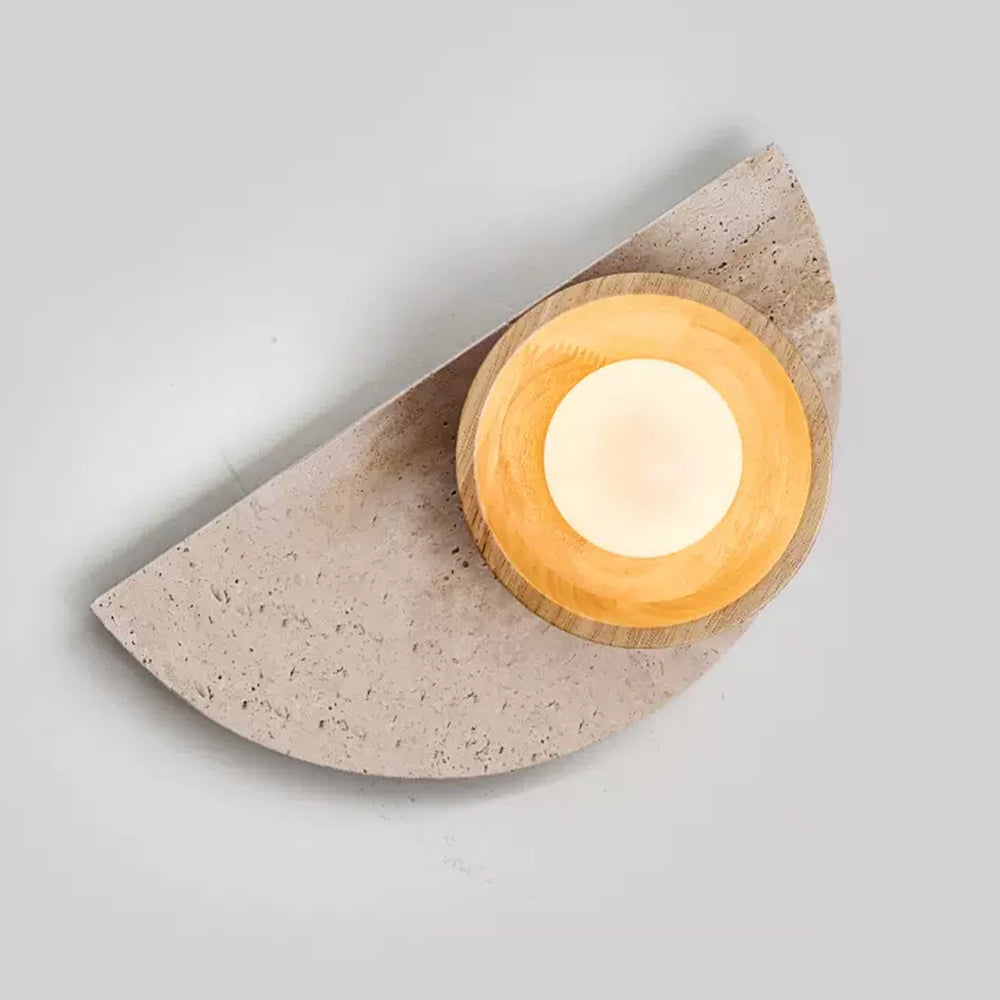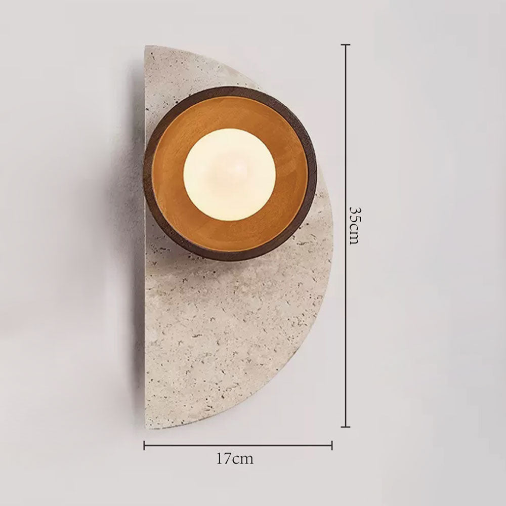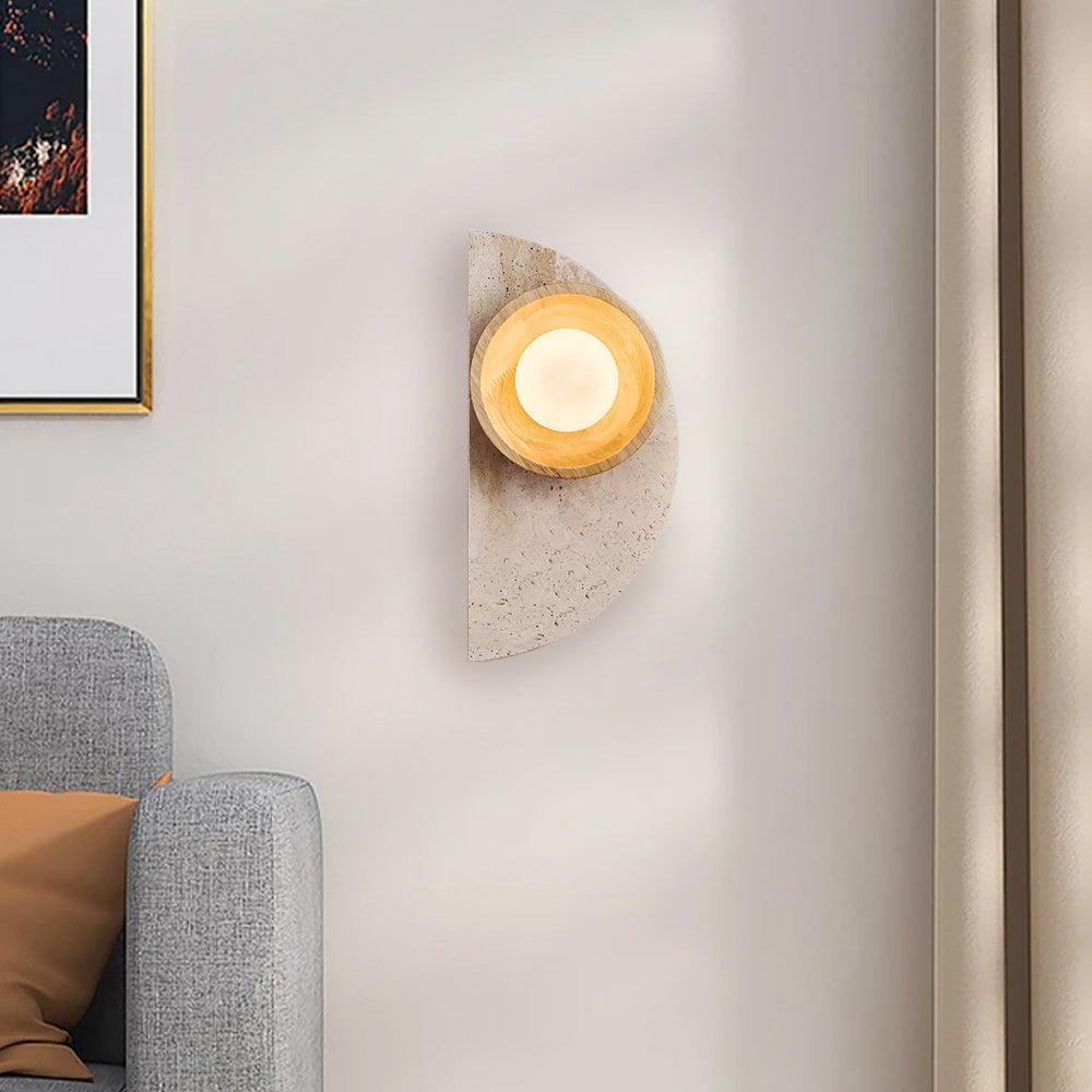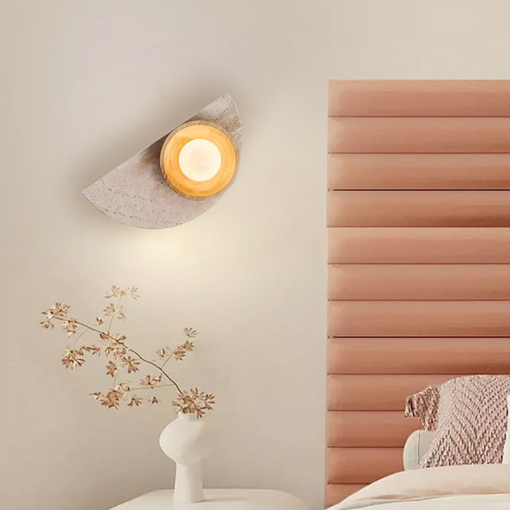 This wall lamp perfectly combines classic and modern elements, creating a feeling of time travel. The unique texture and feel of the travertine make the background wall full of natural and simple atmosphere; the warmth and texture of the solid wood add a touch of warmth and comfort to the whole space; and the addition of the glass art lamp not only brings soft light to the living room, but also makes the whole space full of artistic and romantic atmosphere under the background of the light.