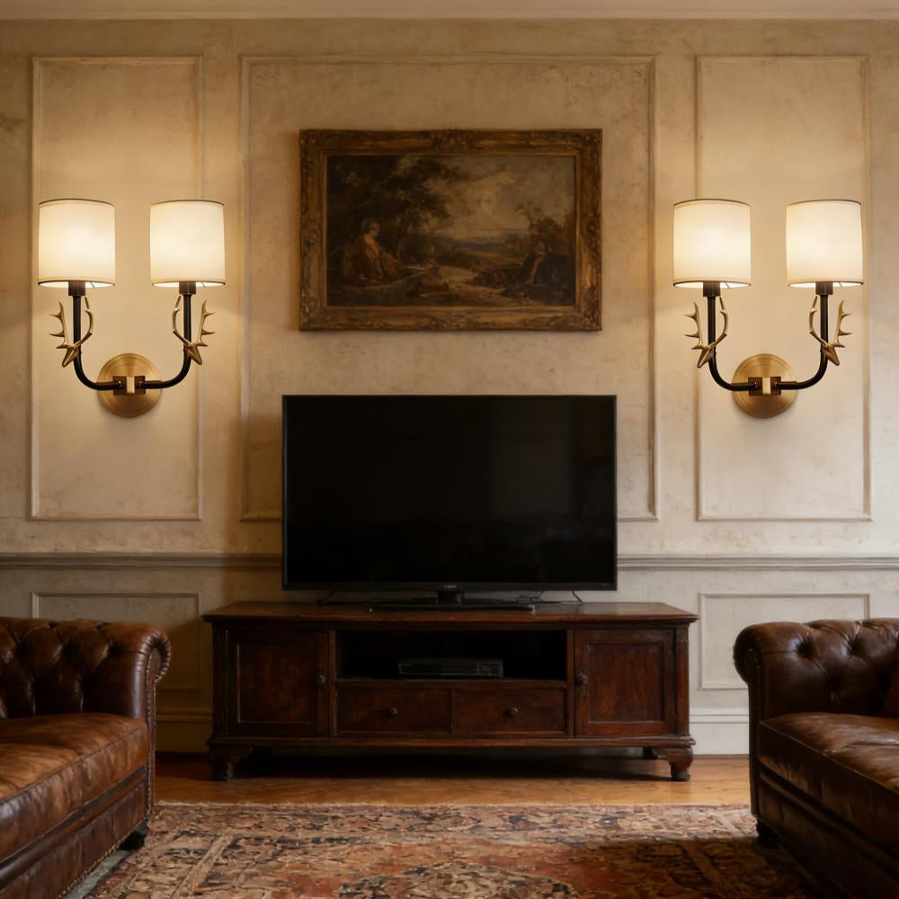 Highlights a charming deer head shape paired with ductile artificial silk lampshades. This double-head fixture has two light sources, each linked to a circular back panel—clean brass lines blend traditional warmth with modern style seamlessly.