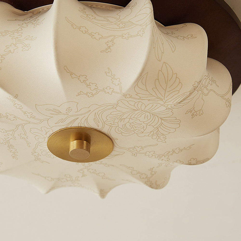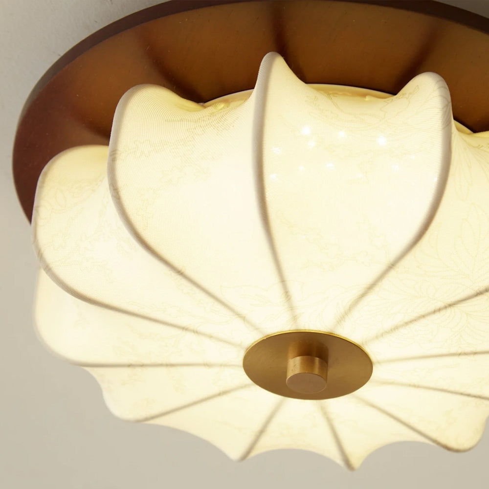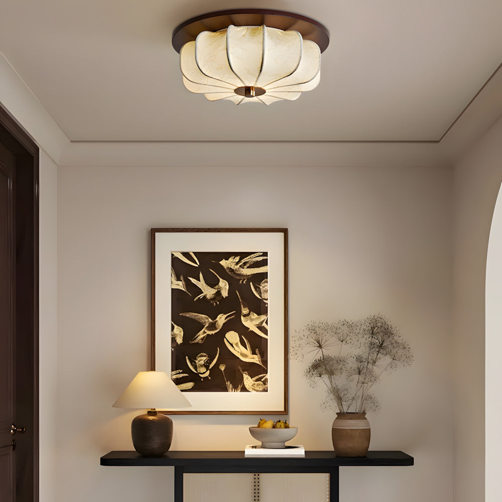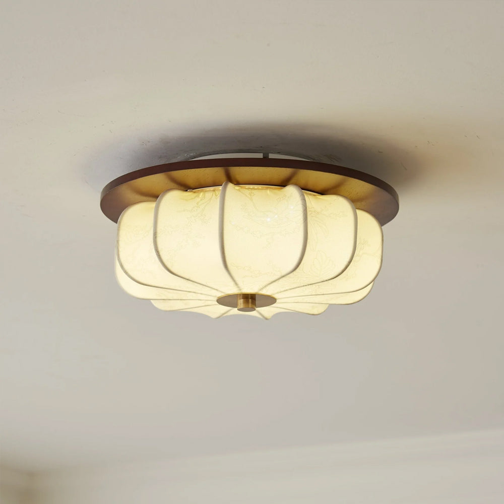 Elevate your space with poetic elegance!Lotus-inspired curved panels cast warm ambient light, etched with intricate patterns. Cream fabric shade + bronzed canopy add modern refinement, delivering quiet luxury to any living space.