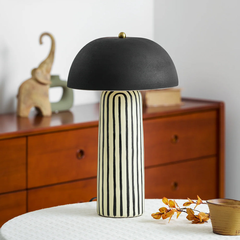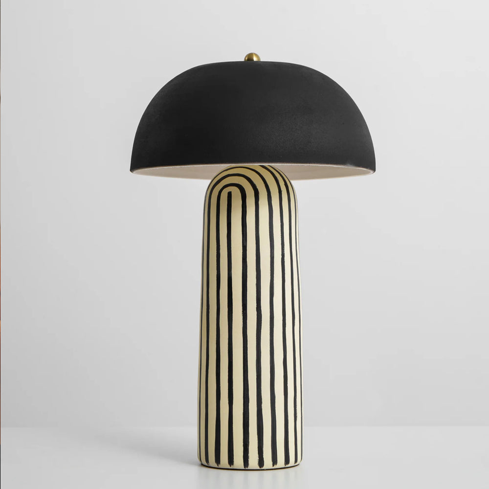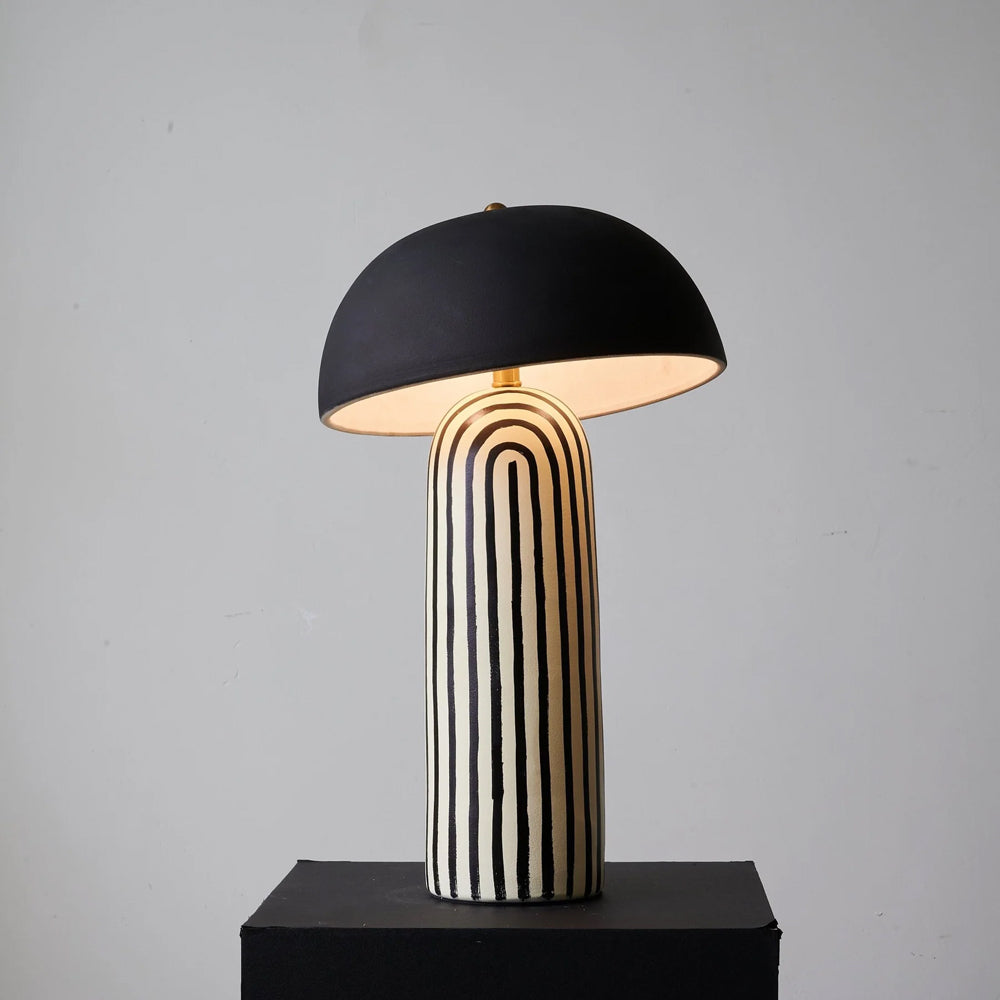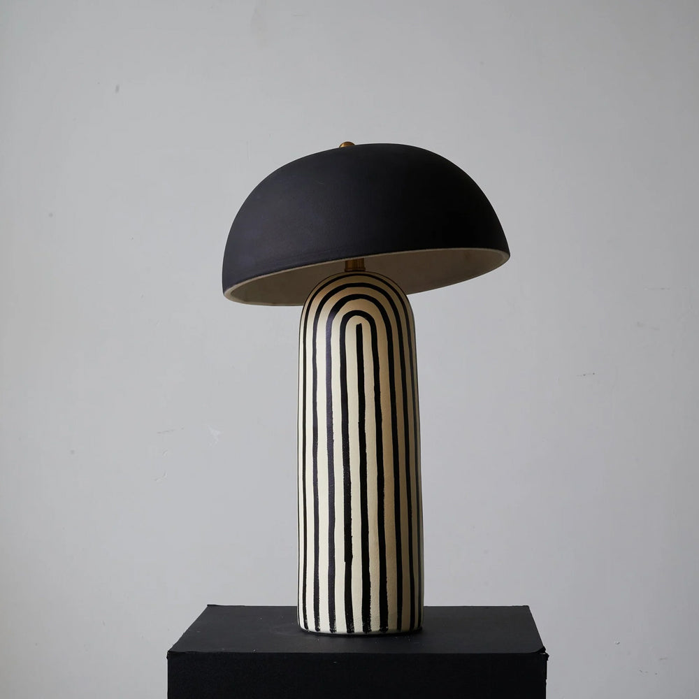 Featuring a hand-painted striped ceramic base and a matte black dome, this mushroom table lamp is a bold, modern statement piece. Perfect for bedside or office tables, it blends playful patterns with sophisticated, confident interior styling.