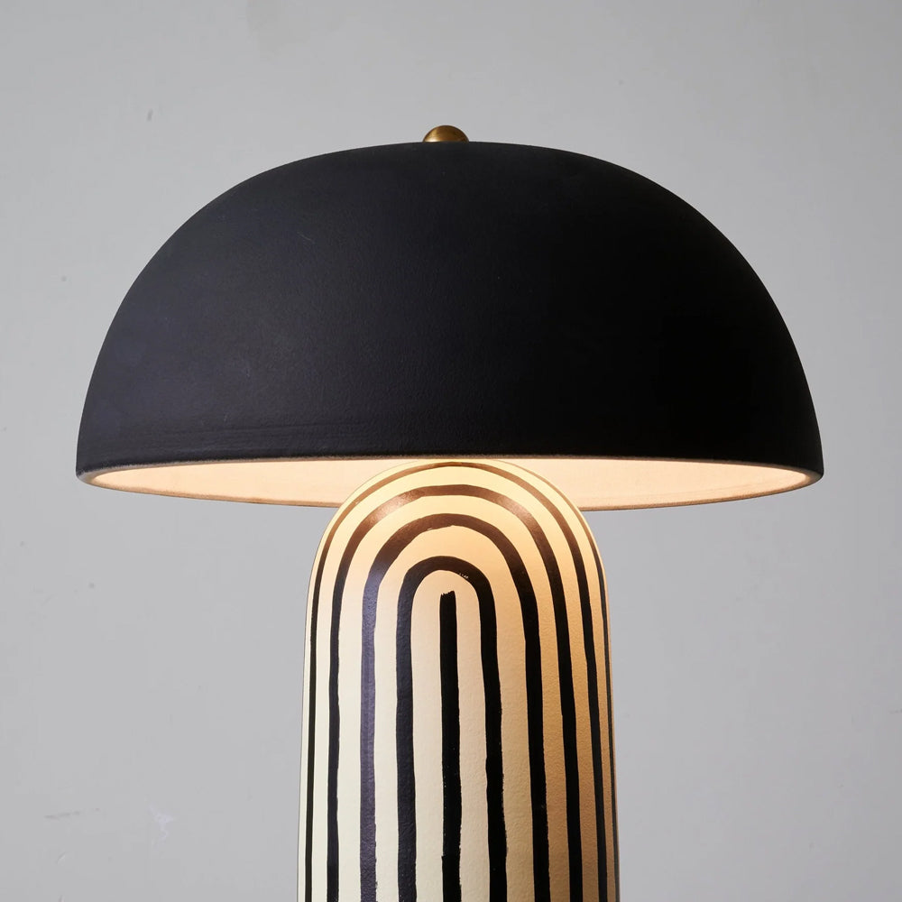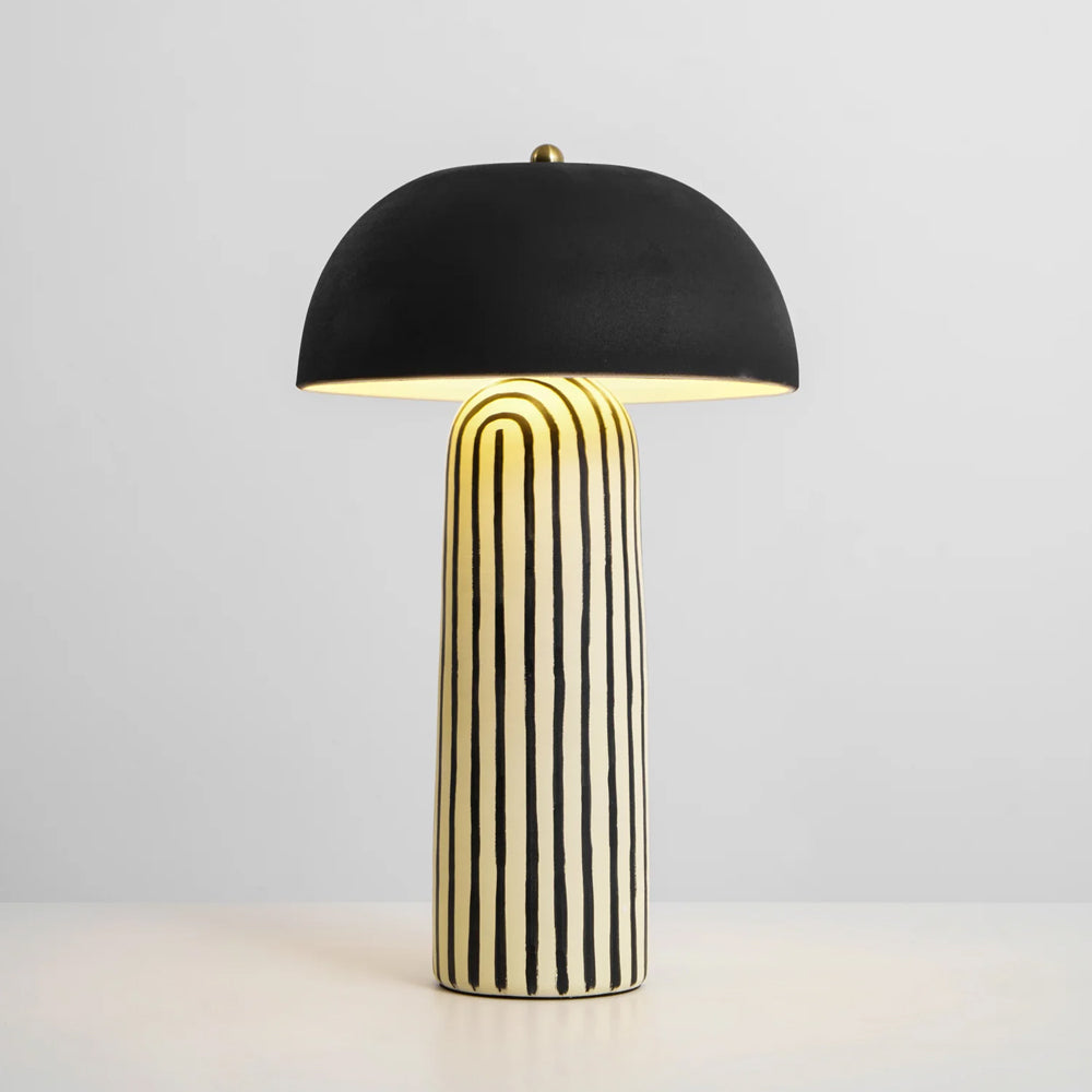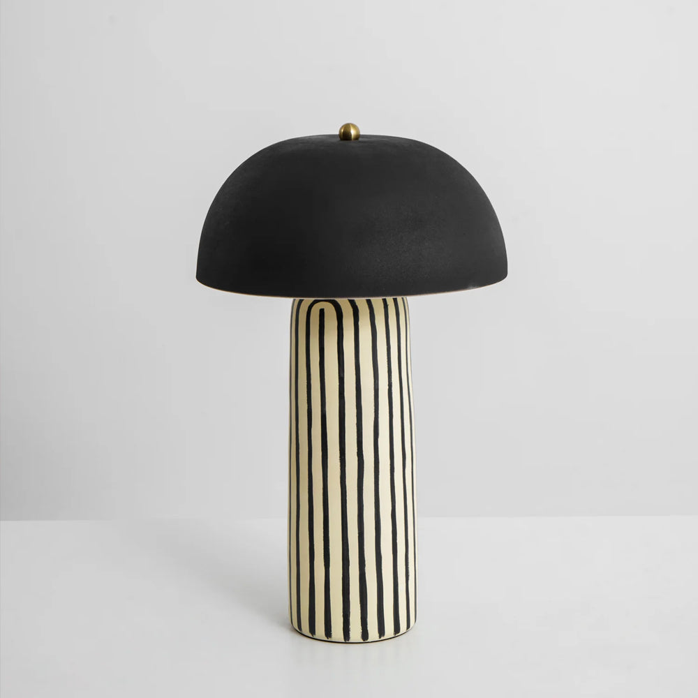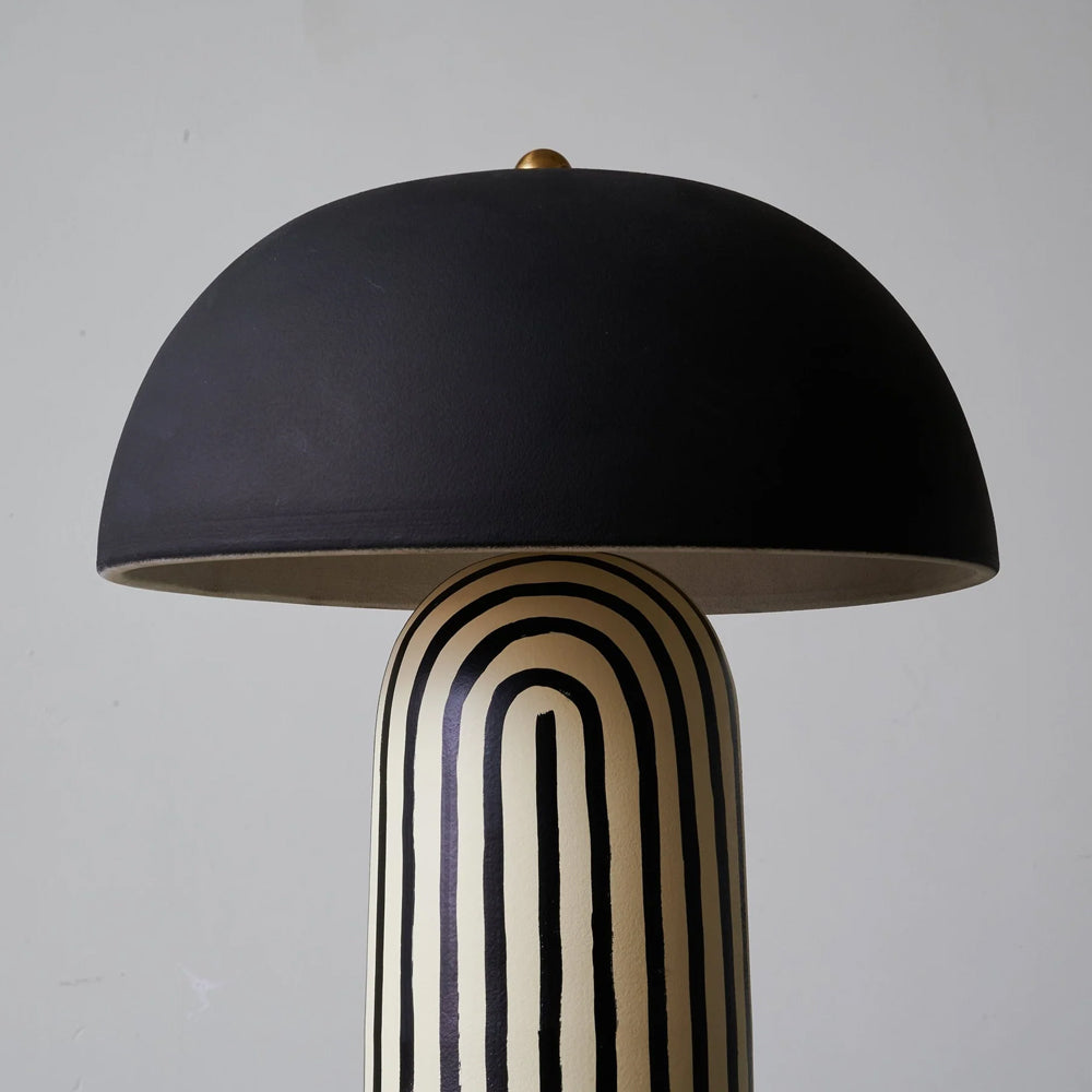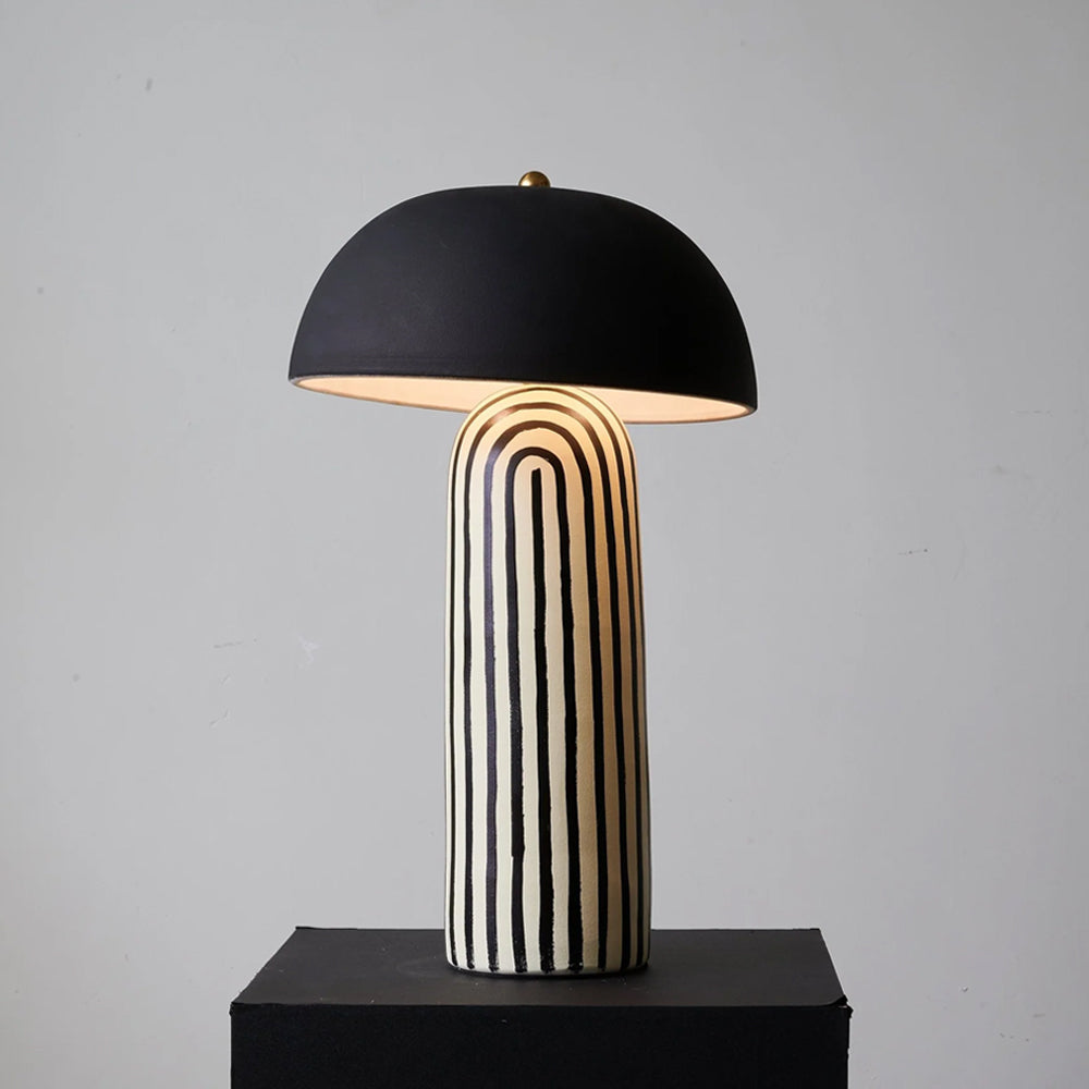 Featuring a hand-painted striped ceramic base and a matte black dome, this mushroom table lamp is a bold, modern statement piece. Perfect for bedside or office tables, it blends playful patterns with sophisticated, confident interior styling.