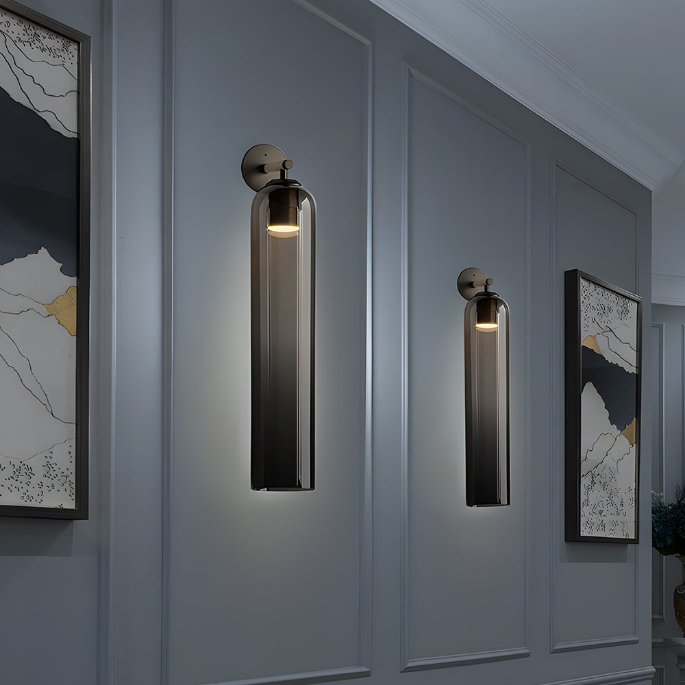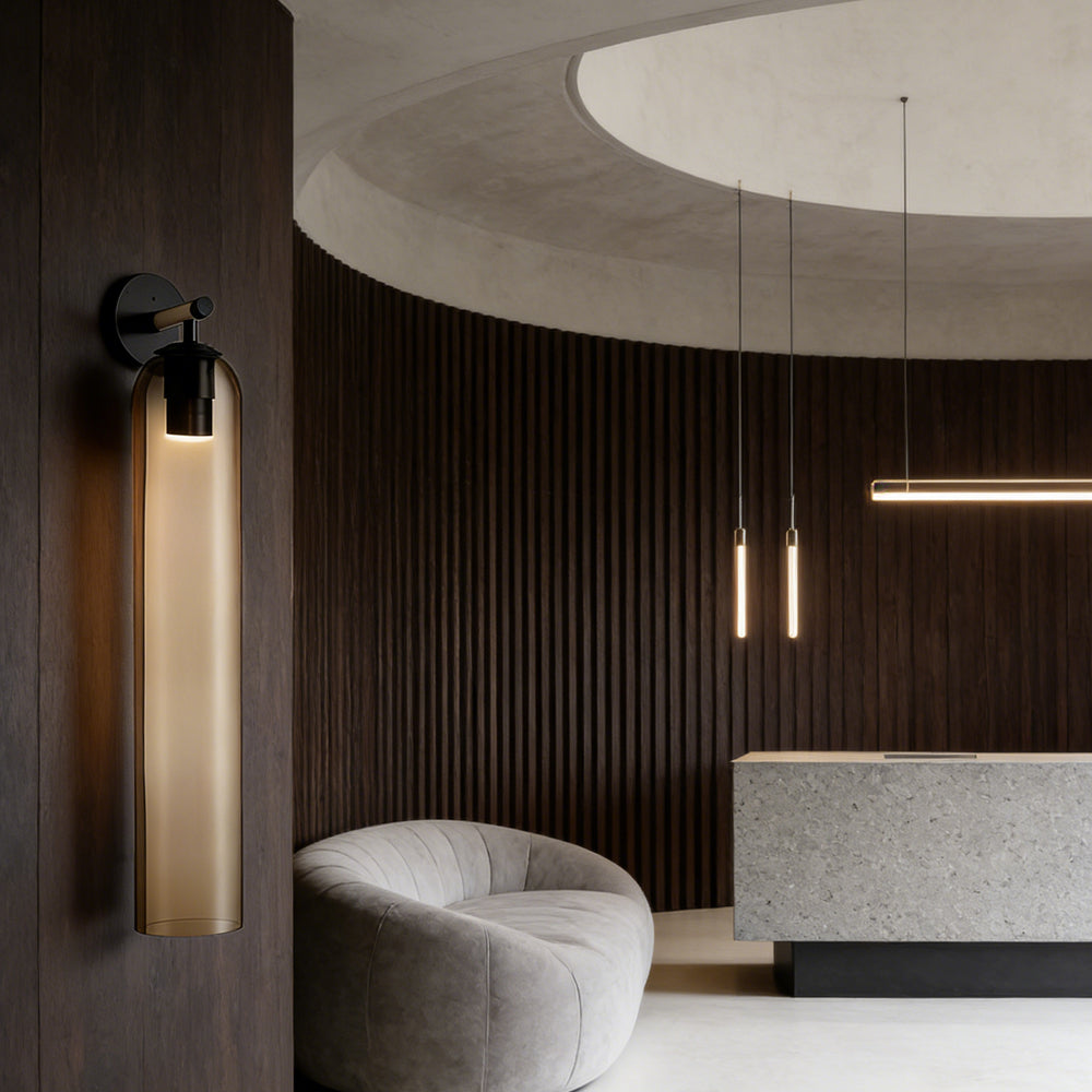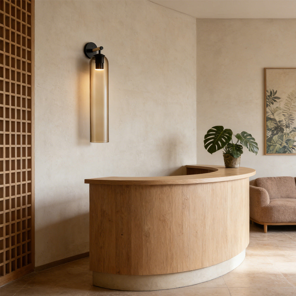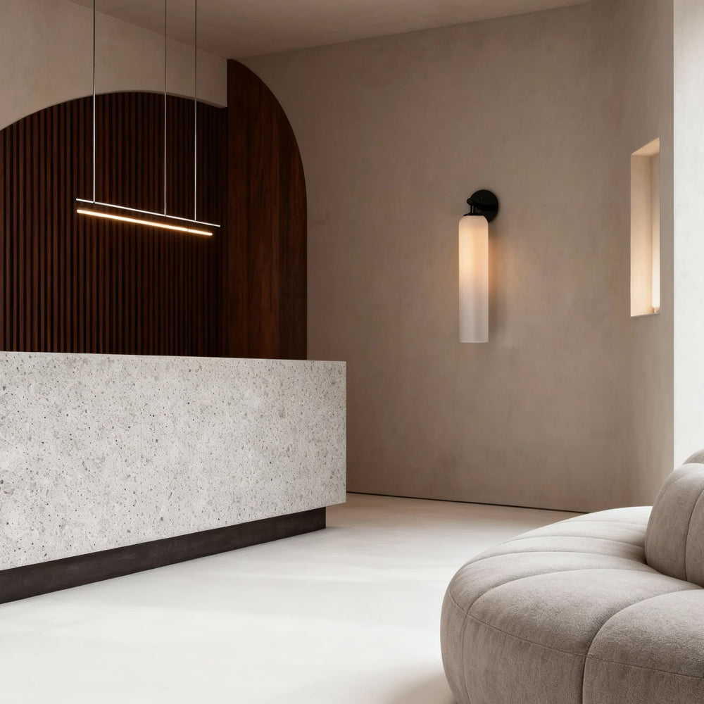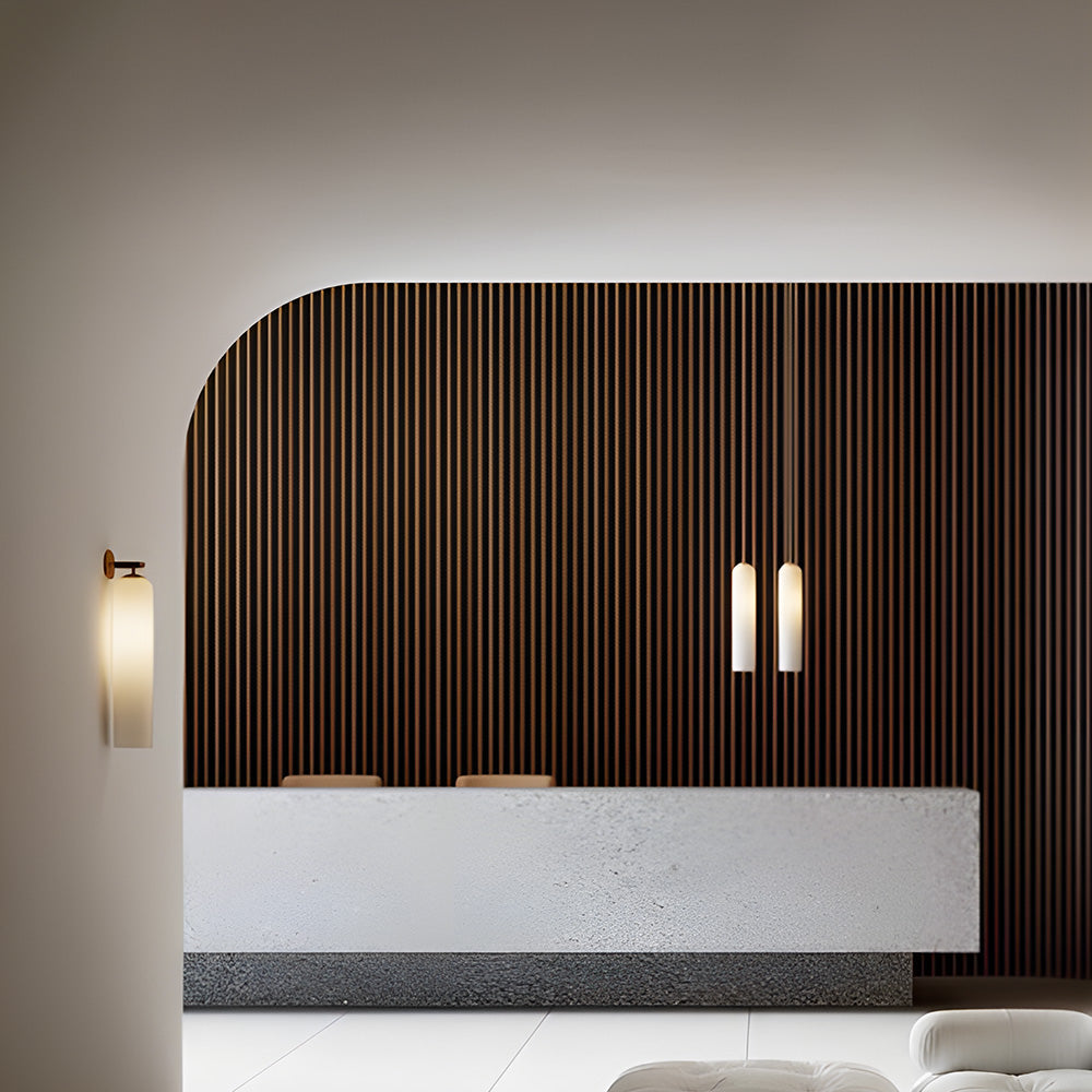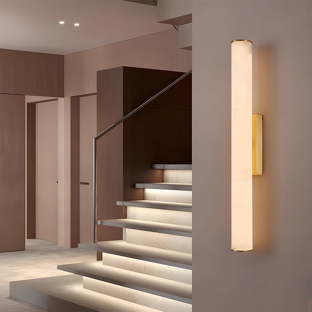 This wall lamp features a simple cylindrical form, combining natural marble slices with solid brass metal structure. It is suitable for corridors, bedside areas, entryways, and high-end commercial spaces.