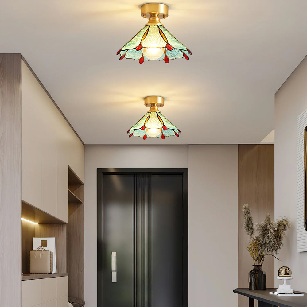 The Retro Classic Tiffany Stained Glass Ceiling Light blends vintage allure and modern grace. Its handcrafted colored glass shade and brass base make it a refined pick for lovers of retro design.