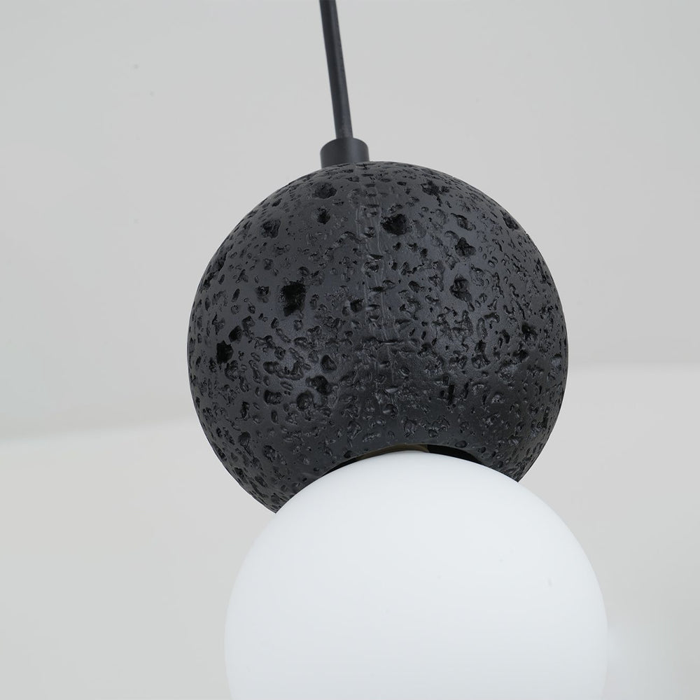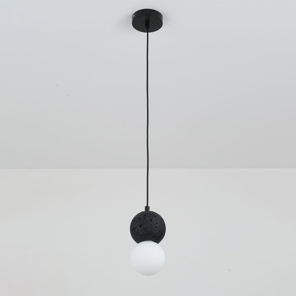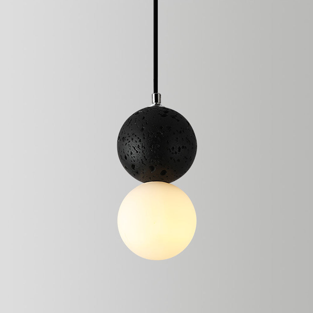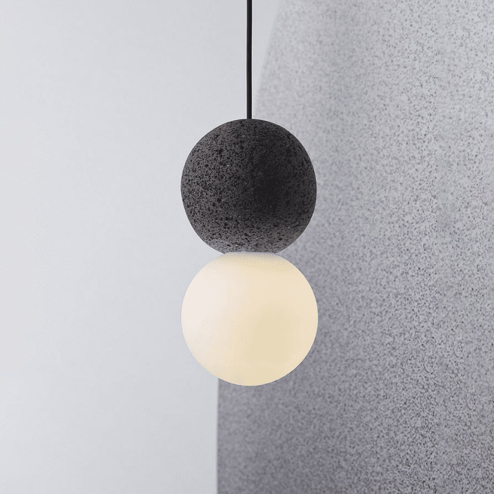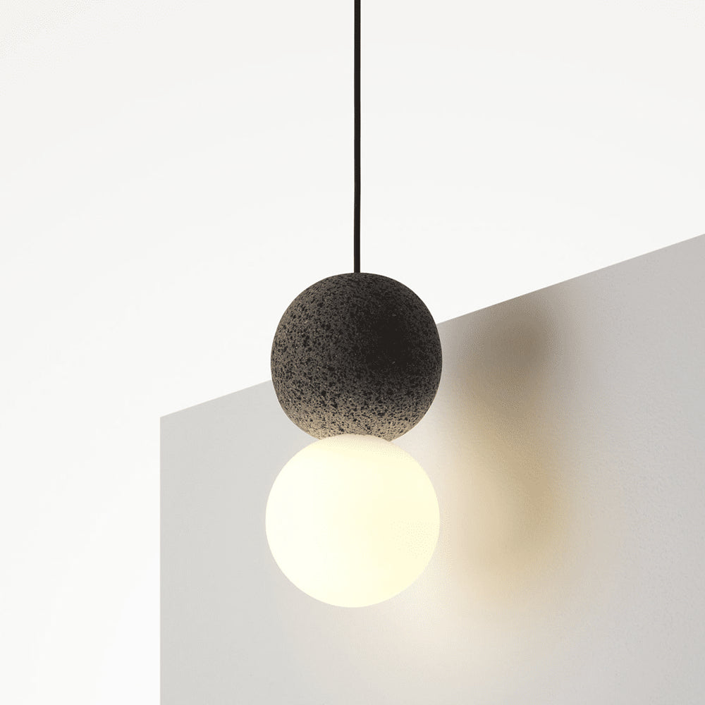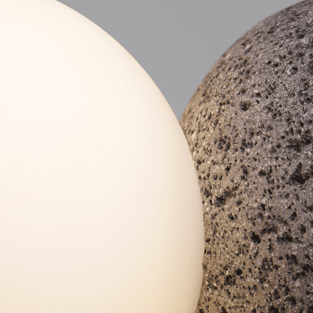 Featuring a sphere of volcanic rock and opal glass, this lamp creates a fundamental dialogue between light and shadow. Light grazes the textured rock to reveal its contour, expressing a essential balance between the heavy and the light.
