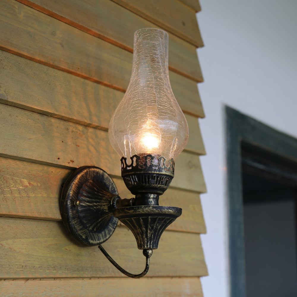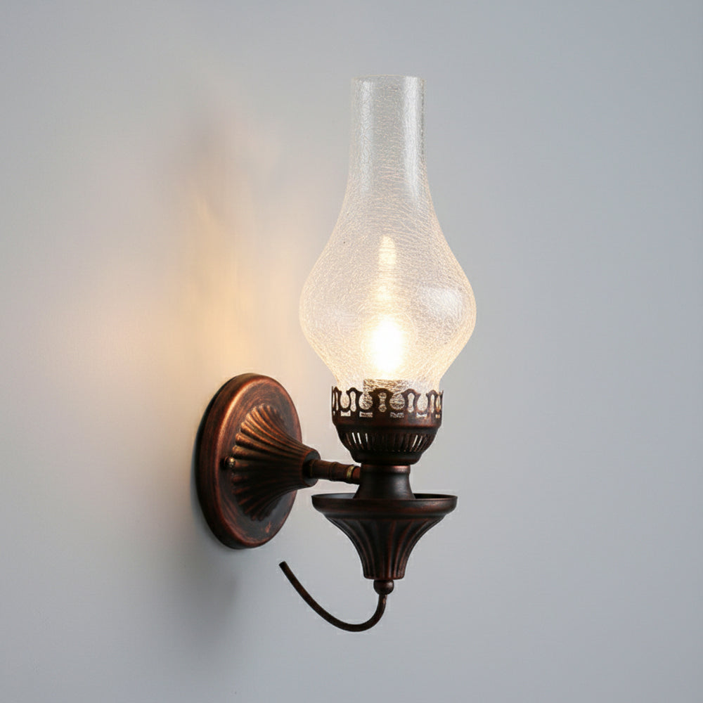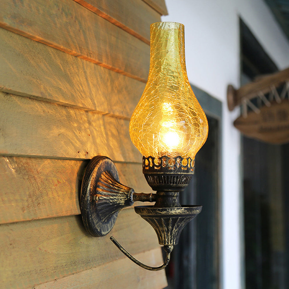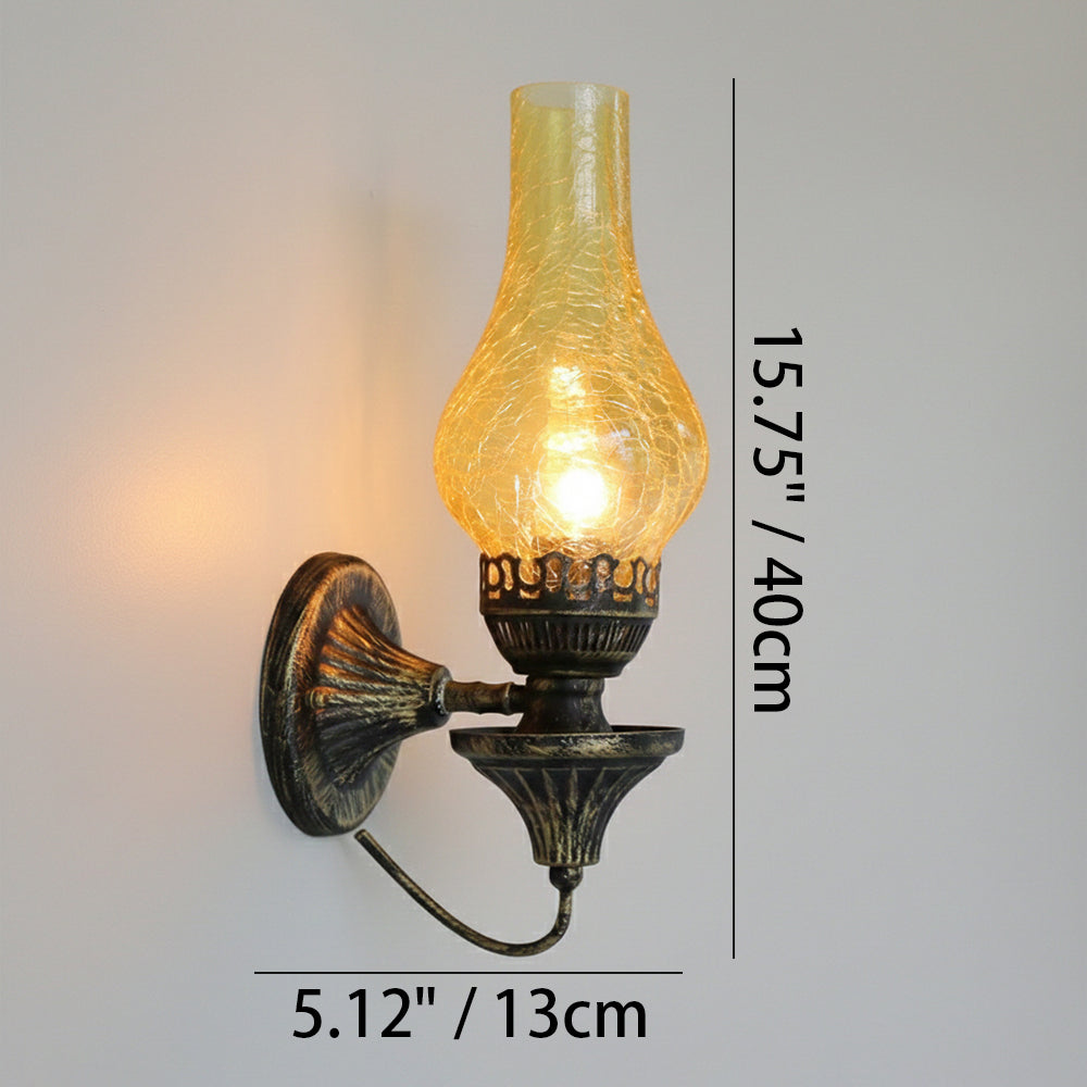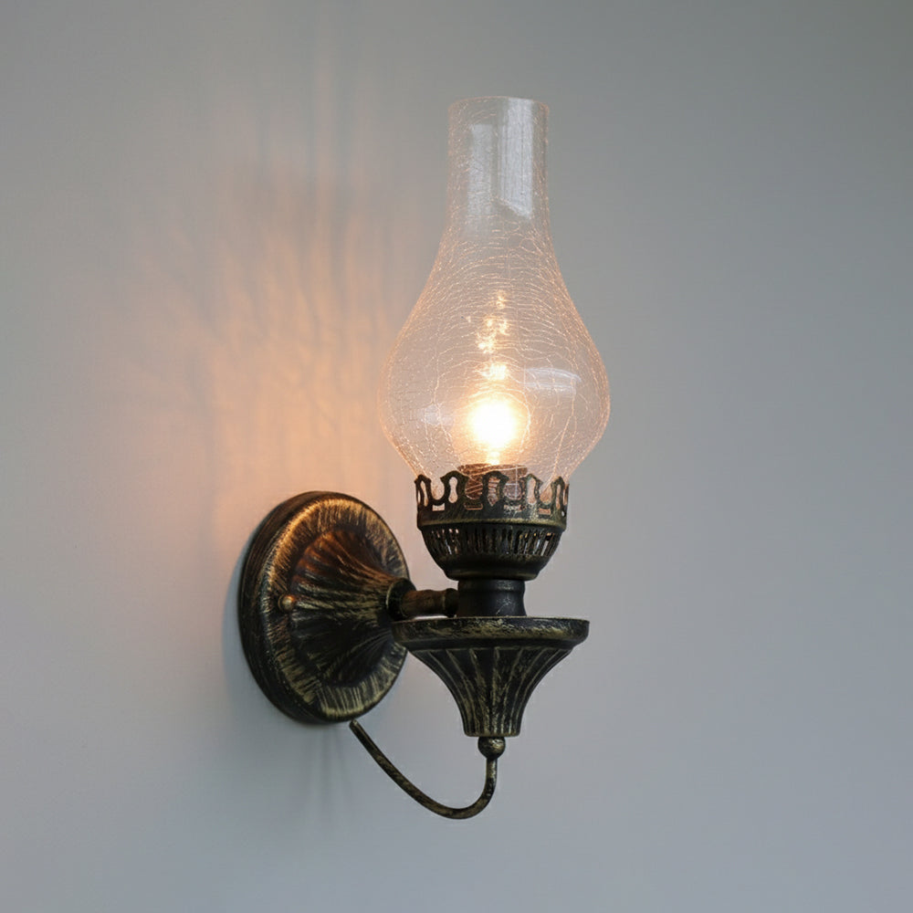 Embrace vintage charm with this Oil Lamp-style Wall Light. The crackled glass shade reproduces the warm glow of burning candles, paired with a robust, rust-proof metal frame. A perfect blend of nostalgic design and modern, sturdy craftsmanship.