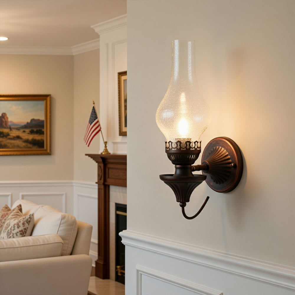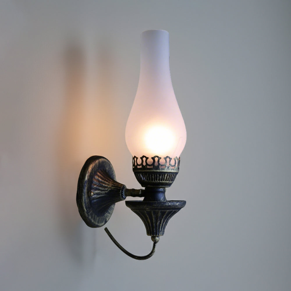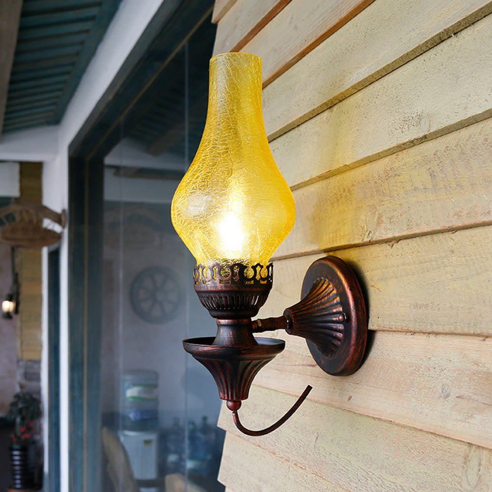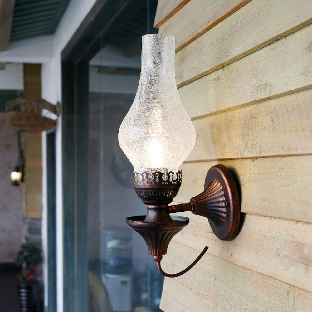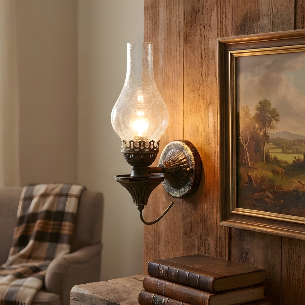 Embrace vintage charm with this Oil Lamp-style Wall Light. The crackled glass shade reproduces the warm glow of burning candles, paired with a robust, rust-proof metal frame. A perfect blend of nostalgic design and modern, sturdy craftsmanship.
