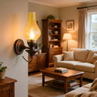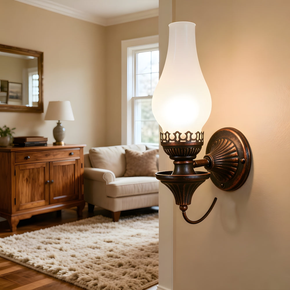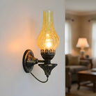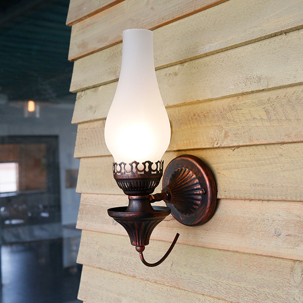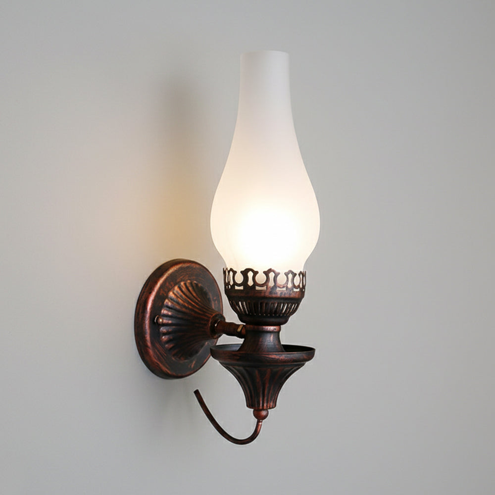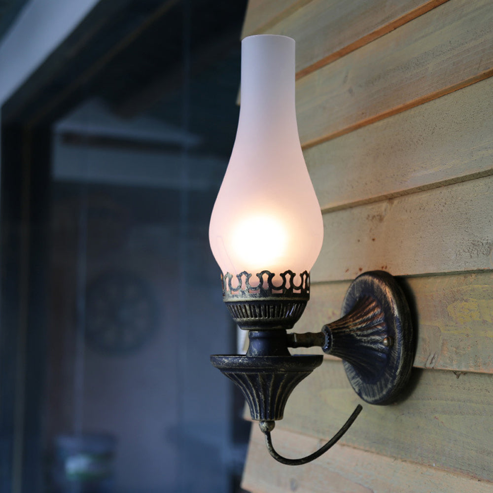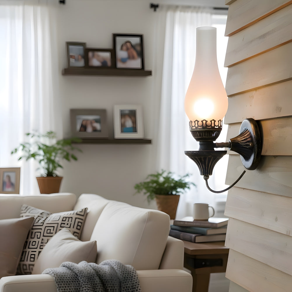 Embrace vintage charm with this Oil Lamp-style Wall Light. The crackled glass shade reproduces the warm glow of burning candles, paired with a robust, rust-proof metal frame. A perfect blend of nostalgic design and modern, sturdy craftsmanship.